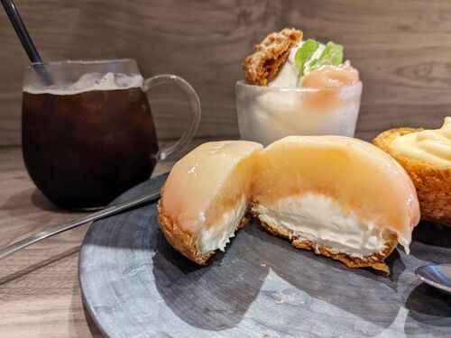 さくさくクッキーシューの専門店で桃のプレートパフェ